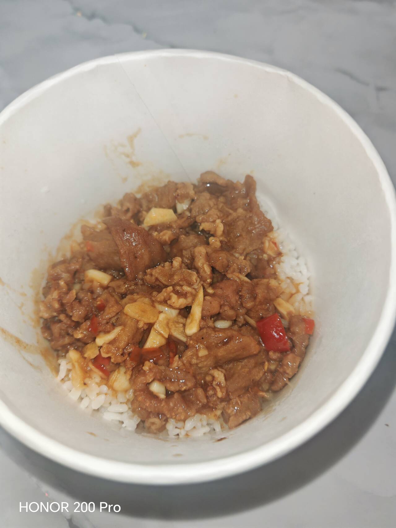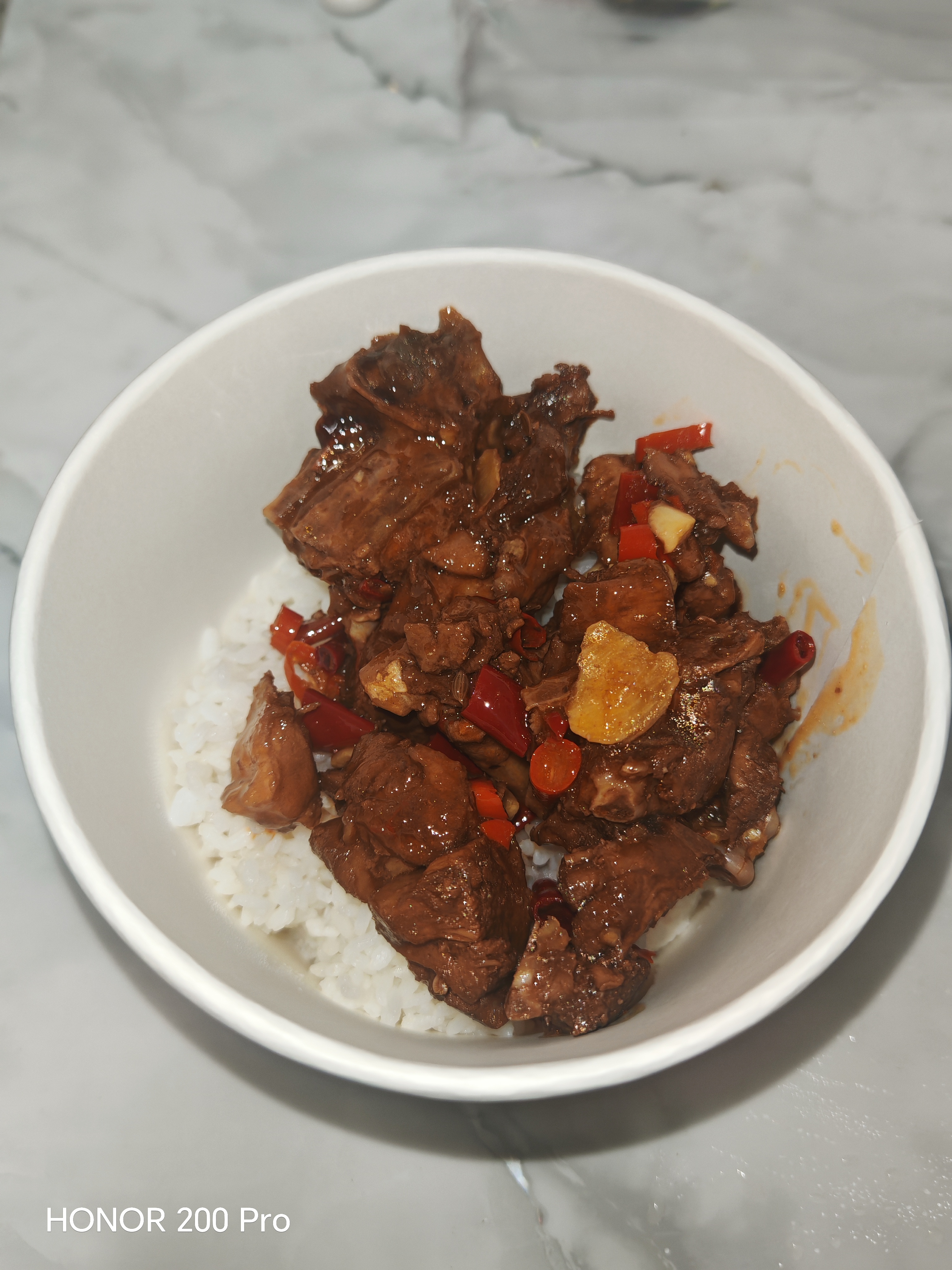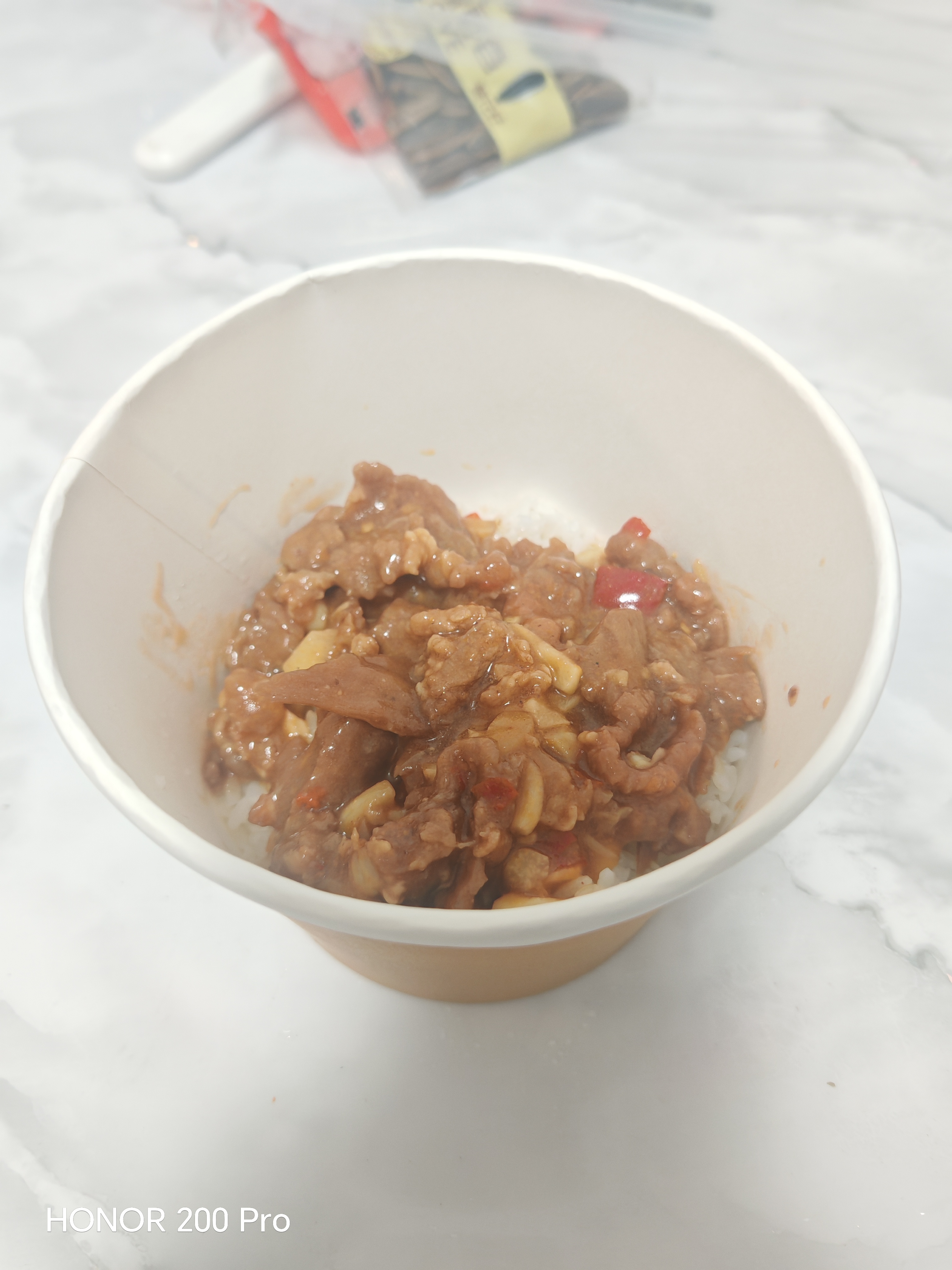 这份预制菜的牛肉确实足够嫩,牙齿滑入肉片时,能感受到被牛肉纤维精准锁住的水分。它的香味也十分自然,能清晰地闻到鲜蒜、耗油和生抽的味道。它在汤汁上下的功夫也不少,即使没有肉,光靠汤汁拌饭我也能干完一整碗饭。(我觉得这也有很大一部分原因要归功于电饭煲和大米本身的质量,煮出来的米饭软硬适中,吸饱料汁后的口感绝佳。)